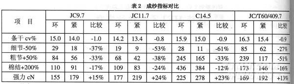 從表l、2比較結(jié)果看,毛羽減少50%~60%,強力提高15%~25%。同時可改善成紗條干,減少細節(jié)、粗節(jié)、棉結(jié),改善紗線外觀。還能適當提高紡紗速度。