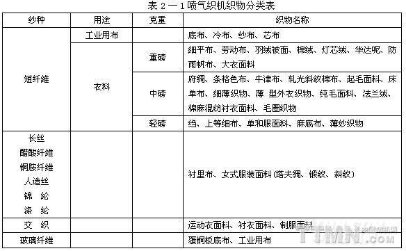 噴氣織機(jī)織造范圍見(jiàn)圖2—1。噴氣織機(jī)織物分類見(jiàn)表2—1。