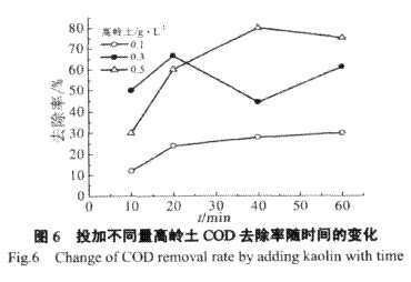 從圖6中可以看出,在廢水中投加了高齡土的陶瓷膜對COD的去除率要大于不投加的COD去除率,并且隨著高嶺土在廢水中濃度的上升COD的去除率也呈現(xiàn)了上升的趨勢。分析其原因是廢水中含有一定量的游離微生物和可溶性細(xì)胞產(chǎn)物,投加高嶺土形成動態(tài)膜能增加對分子量較大的可溶性細(xì)胞產(chǎn)物和游離微生物的截留[9],從而提高了廢水COD的去除率。高嶺土投加量為0.5g·L-1時(shí)較投加0.3g·L-1時(shí)COD去除率增加不明顯,而且隨著運(yùn)行時(shí)間的增加去除率還會有一定程度的下降,所以綜合考慮各種因素認(rèn)為在廢水原液中投加0.3g·L-1的高嶺土對廢水COD去除效果最優(yōu),平均去除率達(dá)到50%左右。