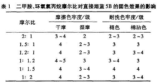 2.1.1二甲胺、環(huán)氧氯丙烷摩爾比對固色劑的影響按照1.3固色劑的合成方法進行合成實驗,二甲胺、環(huán)氧氯丙烷反應(yīng)2h后,滴加占反應(yīng)單體總質(zhì)量2%的四乙烯五胺,反應(yīng)2h后升溫至70℃.改變二甲胺和環(huán)氧氯丙烷的摩爾比,將所得的一系列產(chǎn)品分別對直接湖藍5B染色的棉織物進行固色處理,測試其各項色牢度,結(jié)果如表1所示.