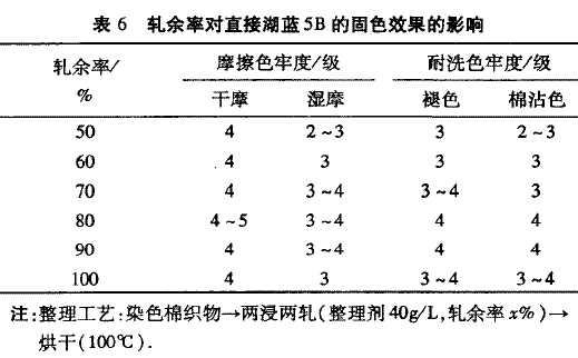 多胺型固色劑在不同軋余率下對(duì)直接湖藍(lán)5B染色棉織物進(jìn)行處理,測(cè)得織物色牢度如表6所示.從表6可以看出,軋余率為80%左右時(shí)固色劑的固色效果最好.原因可能是在一定的范圍內(nèi),隨著織物帶液率的增大,軋后留在織物上的固色劑量越多,固色劑與染料間的結(jié)合越充分.在軋余率超過(guò)80%后,其帶液率太高,在織物上殘留較多的固色劑量,反而使其固色效果變差.
