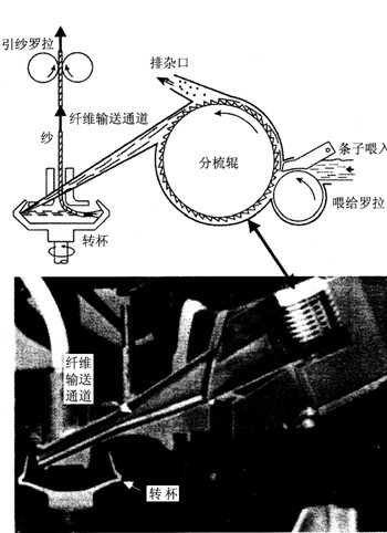 當(dāng)接頭紗從引紗管吸入杯內(nèi)時,在離心力作用下被拋向凝聚槽與纖維環(huán)搭接,然后由引紗羅拉引出紗條。紗條隨轉(zhuǎn)杯回轉(zhuǎn)而加捻,如圖3—1、3—2所示。纖維不停地喂入、紗條不斷被加捻成紗,再由引紗羅拉輸出,從而實現(xiàn)了連續(xù)紡紗。