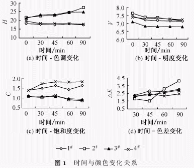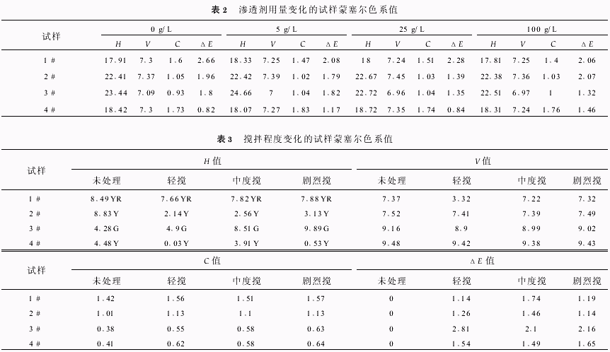 天然彩色棉機(jī)織物果膠酶處理的色變規(guī)律李茂松 周文龍 唐志榮(浙江理工大學(xué)材料與紡織學(xué)院,杭州,310033)摘要:用果膠酶對(duì)天然彩色棉機(jī)織物(棕、綠)進(jìn)行處理,分析不同條件下的色變規(guī)律。實(shí)觀發(fā)現(xiàn):果膠酶處理后棕色棉的黃紅色調(diào)在蒙塞爾色系向逆時(shí)針變化,而綠色棉的黃綠色調(diào)向順時(shí)針變化;彩色棉的明度隨處理時(shí)間的增加而下降,色澤加深;飽和度隨處理時(shí)間的增加棕色棉上升,而綠色棉下降;酶用量引起的明度和飽和度變化幅度相對(duì)較小;色差ΔE隨時(shí)間、酶用量增加而增大;滲透劑濃度和實(shí)驗(yàn)室條件下的攪拌程度對(duì)顏色無(wú)明顯影響。關(guān)鍵詞:彩色棉 機(jī)織物 果膠酶 色變中圖分類(lèi)號(hào):TS1925 文獻(xiàn)標(biāo)識(shí)碼:A 文章編號(hào):02539721(2004)05006103 天然彩色棉織物在遇酸、堿、氧化劑、還原劑、滲透劑、洗滌劑、皂煮、柔軟、免燙抗皺、高溫等處理時(shí)存在著變色問(wèn)題。如何解決或利用產(chǎn)品的色變性能,對(duì)彩色棉產(chǎn)品的開(kāi)發(fā)有重要現(xiàn)實(shí)意義。已有研究表明,對(duì)彩色棉進(jìn)行生物酶處理也是代替?zhèn)鹘y(tǒng)堿處理的一種很好的綠色整理方法。本文就果膠酶處理彩色棉的色變規(guī)律進(jìn)行了研究,現(xiàn)報(bào)道如下。1 實(shí)驗(yàn)材料與方法1.1 原材料堿性果膠酶(BioPrepL,3000APSUg)由諾維信公司提供;滲透劑由杭州市余杭艾迪精細(xì)化工研究所提供。本實(shí)驗(yàn)采用的試樣組織為21右斜紋機(jī)織物,其結(jié)構(gòu)參數(shù)列于表1。1.2 織物的處理?xiàng)l件使用恒溫水浴鍋,控制處理液pH值為80~90、溫度為55℃、浴比為1∶20,改變酶濃度、處理時(shí)間、攪拌程度和是否添加滲透劑等處理?xiàng)l件,織物處理后用90℃水洗5~10min,然后冷水洗5~10min,晾干待用。1.3 色差測(cè)定采用SM4型色差儀進(jìn)行織物的色澤測(cè)定,采用蒙塞爾色系(H代表色調(diào),V代表明度,C代表飽和度,ΔE代表色差),每塊試樣取5個(gè)數(shù)的平均值。2 結(jié)果與討論2.1 處理時(shí)間