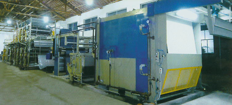 織造好的坯布經(jīng)過:刷毛機刷除雜質(zhì)、燒毛機燒去茸毛、上漿槽及軋車添加漿料及助劑、拉斜部分拉出緯向斜度、烘燥部分烘干定型、滿足牛仔布的特定風(fēng)格。預(yù)縮部分利用預(yù)縮毯工作時產(chǎn)生的長度尺寸變化,使織物在高溫、高壓下纖維澎化重組,改變經(jīng)緯密度,消除、減少織物的收縮特性,預(yù)縮后的織物再經(jīng)呢毯整理進一步穩(wěn)定尺寸,明顯改善織物的手感。