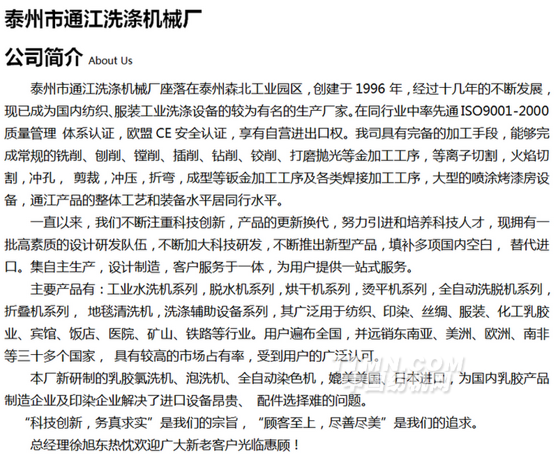 泰州市通江洗滌機(jī)械廠、是專業(yè)制造和銷售洗滌機(jī)械的廠家,主要生產(chǎn):30kg—70kg服裝面料打樣機(jī),100kg—400kg工業(yè)洗滌機(jī),30kg—150kg自動(dòng)蒸汽烘干機(jī),直徑500—1500型全不銹鋼脫水機(jī),100kg—300kg成衣染色機(jī),270kg日式全自動(dòng)電腦變頻牛仔服水洗石磨洗滌機(jī),牛仔燈心絨噴砂機(jī),200kg—400kg皮革揉紋機(jī),100---150kg皮革揉紋烘干機(jī)。以上產(chǎn)品廣泛適用于服裝后整理,水洗,砂洗、石磨、噴砂、染色等服裝加工業(yè)務(wù)。本廠注重產(chǎn)品的質(zhì)量和信譽(yù),以及星級售后服務(wù),產(chǎn)品不僅暢銷全國,而且出口東南亞等地區(qū)。產(chǎn)品實(shí)行三包,終身服務(wù),并長期提供各種配件和修理服務(wù)。