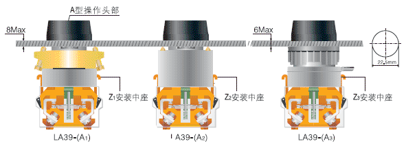 LA39-(A3)系列按鈕開關(guān):采用螺帽緊固方式,樸實(shí)簡潔,降低安裝難度,減輕了用戶工作強(qiáng)度。受環(huán)境溫度影響會降低安裝可靠性,建議使用旋鈕、鑰匙鈕等帶旋轉(zhuǎn)工作狀態(tài)時(shí)不宜采用Z3中座安裝模式。如A3選擇使用旋鈕需加擋圈,開孔形狀如右圖