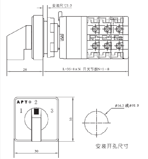 ■單孔安裝,中心一個(gè)φ16mm或φ22mm圓孔進(jìn)行安裝,可以和按鈕配置在一起安裝;