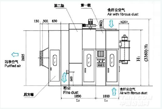 由第一級(jí)除塵機(jī)組和第二級(jí)除塵機(jī)組構(gòu)成。第一級(jí)主要過(guò)濾、分離、收集被處理空氣中的纖維和塵雜;第二級(jí)主要過(guò)濾、分離、收集第一級(jí)過(guò)濾后空氣中的微粒粉塵,使空氣凈化到可以回用或排放的標(biāo)準(zhǔn)。
