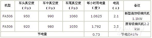 金馳在細紗機上配置高效吸棉風機有1.1kW、1.5kW兩種規(guī)格,替代原細紗機2.2KW、1.5KW軸流吸棉風機。它減少了壓力損失,提高了風機性能,具有近40%的節(jié)能效果,經(jīng)濟效益十分顯著。我們在南通大生集團有限公司的經(jīng)緯產(chǎn)FA506細紗機(480錠)上批量改造前、后實際測試數(shù)據(jù)如下: