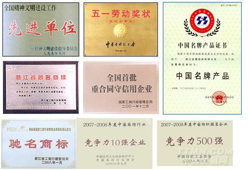 1992年以來,企業(yè)被列入"中國500家最大機械工業(yè)企業(yè)"、"國家機電產品出口基地企業(yè)"、"外貿自營進出口企業(yè)",連續(xù)12年在全國紡機行業(yè)綜合經濟指標評比中名列前十強。先后被授予"全國五一勞動獎狀先進集體"、"全國精神文明建設先進單位"、"浙江省最佳經濟效益工業(yè)企業(yè)"、"浙江省技術進步優(yōu)秀企業(yè)"、董事長傅國定同志于1988年起先后被中華全國總工會、國務院授予"全國優(yōu)秀經營管理者"、"五一勞動獎章"和"全國勞動模范"。于2001年被國家工商行政管理總局評為 “全國首批重合同守信用企業(yè)”。2005年9月,“金鷹”牌桑蠶絹絲,2007年9月“金鷹”牌亞麻紗被國家質檢總局評為"中國名牌"產品。2008年1月,“金鷹”商標被國家工商行政管理總局商標局認定為中國“馳名商標”,2008年7月,公司榮獲中國麻紡行業(yè)競爭力10強和中國紡織服裝企業(yè)競爭力500強稱號。