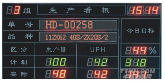 1)車間LCD看板系統(tǒng)——滾動顯示訂單生產(chǎn)進度、當前車間的生產(chǎn)任務(wù)、產(chǎn)量匯總信息、車間布帳流轉(zhuǎn)信息等。