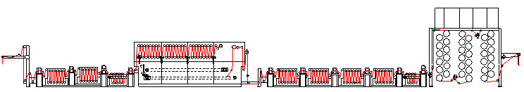 平幅進布→浸漬槽→二輥軋車→水洗機→二輥軋車→水洗機→三輥軋車→平洗槽→二輥軋車→導輥汽蒸箱→浸漬槽→二輥軋車→水洗機→二輥軋車→水洗機→二輥軋車→水洗機→二輥軋車→水洗機→二輥軋車→平洗槽→三輥軋車→烘筒烘燥機→平幅落布
