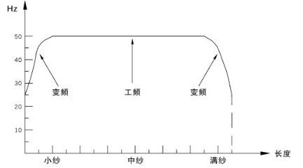 在小紗與大紗時(shí),主電機(jī)由變頻驅(qū)動(dòng),中紗時(shí)由工頻驅(qū)動(dòng)??捎行Ы档凸模娱L(zhǎng)變頻器使用壽命。