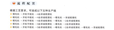 適用原料:山羊絨、駝毛絨、牦牛絨等天然原料,原料經(jīng)過本流程后,將逐級(jí)被開松、去粗、除雜與數(shù)理,最后制成標(biāo)準(zhǔn)的無毛絨。