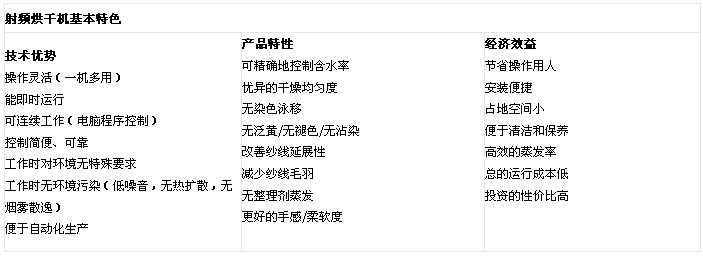 電磁場的穿透性使產品烘干迅速、均勻,設備的進出口結合了傳統(tǒng)的暖空氣循環(huán)系統(tǒng),使纖維具有一定的膨化效應,極大地改善了彈性、柔軟度、手感和顏色的效果等,保證了產品質量。如此卓越的效果不可能以任何傳統(tǒng)的熱空氣烘干系統(tǒng)能達到。