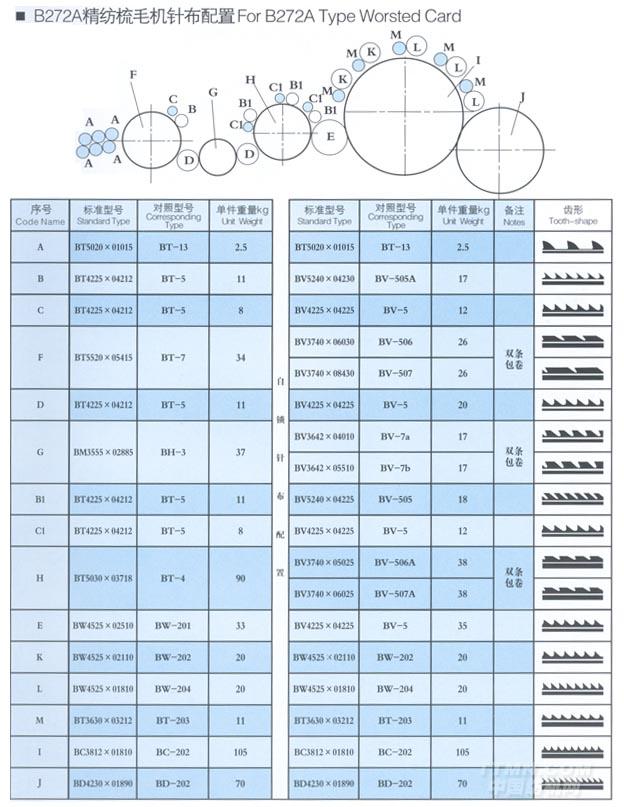 B272A精紡梳毛機針布配置