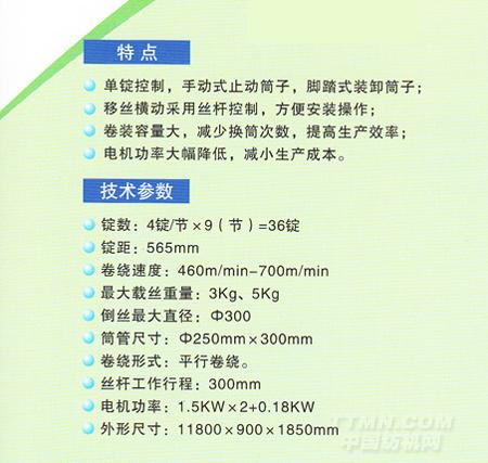 本機(jī)是化纖倍捻機(jī)的后道設(shè)備,把倍捻機(jī)上的卷取筒子倒成大卷裝,與無(wú)梭紡機(jī)配套以減少停機(jī)時(shí)間,提高功效。