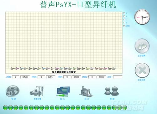 一、功能介紹:因收購棉花過程中的種種原因,使部分異纖維混入棉包;如丙綸絲、有色和白色尼龍、毛發(fā)、布片等幾十種,俗稱“三絲”。嚴重影響了棉紡廠的產(chǎn)品質量。為了降低人工撿“三絲”的成本,我們開發(fā)了PsYX-II型 普聲異纖機。本設備采用多臺高分辨率、多光譜、高速線陣掃描相機,采用特制的白色和紫外光源,合理設置的棉流檢測通道,集機、電、氣于一體的剔除噴吹結構,閾值自適應優(yōu)化算法,高速高性能控制計算機,友善的觸摸屏人機界面等技術,使設備可以輕松識別和撿出頭發(fā)絲,丙綸絲,麻絲,塑料片等各種異纖,并保證設備長期穩(wěn)定、可靠、高效的工作;其基本工作原理為由多臺高速、高分辨率線陣相機分別對透明的檢測通道進行多次掃,相機獲取的圖像數(shù)據(jù)經(jīng)高速數(shù)據(jù)采集卡到高性能計算機,高性能計算機按照一定的算法,檢測每次掃描的數(shù)據(jù),發(fā)現(xiàn)異纖維后,經(jīng)過I/O控制卡控制電磁閥將其用壓縮空氣剔除到排雜通道