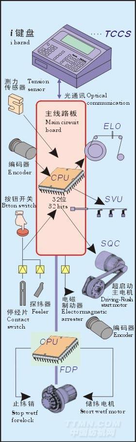 為了滿足噴氣織機(jī)對高速化、通用化以及高質(zhì)量的要求,將基本功能的控制全部統(tǒng)一在32位的主線板上,并對大容量的控制數(shù)據(jù)進(jìn)行高速處理。高速的判斷則利用和光通訊電纜相接的i鍵盤執(zhí)行。