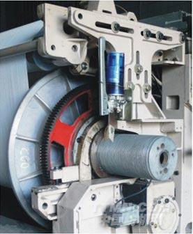 由于采用了機(jī)械式間接卷取,因此可以在不停機(jī)的狀態(tài)下進(jìn)行落布。在卷取傳動上使用了多板式的盤式制動器。從而消除了打滑現(xiàn)象和卷皺,使卷取平整。