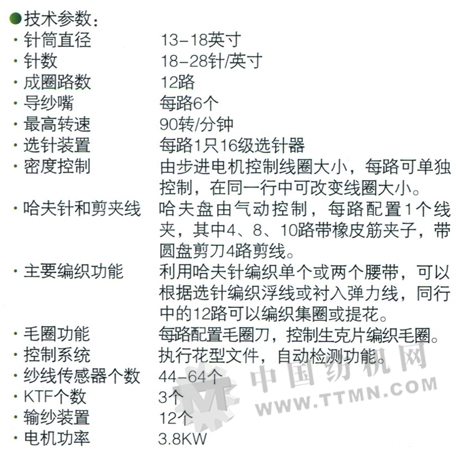 GD-NJ12 12路帶扎口全自動(dòng)單面無(wú)縫針織內(nèi)衣機(jī)是本公司在12路無(wú)頭機(jī)和8路有頭機(jī)成功開(kāi)發(fā)的基礎(chǔ)上自主開(kāi)發(fā)的新機(jī)型。該機(jī)12路進(jìn)線,每路配6個(gè)導(dǎo)紗嘴,其中1#、2#、3#導(dǎo)紗嘴有3個(gè)工作位置,用于編織底紗,4#導(dǎo)嘴紗有2個(gè)工作位置,5#導(dǎo)嘴紗有4個(gè)工作位置,6#導(dǎo)嘴紗有6個(gè)工作位置,5#、6#導(dǎo)嘴紗用于編織色紗或浮線,也可以編織高清晰花型。每路1個(gè)選針器用于生產(chǎn)量身定做的內(nèi)衣、外衣、泳衣和保健織物。根據(jù)要求可織毛圈。